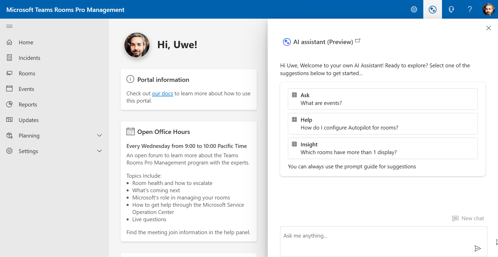 Microsoft rollt im Teams Rooms Pro Management Portal derzeit eine spannende neue Funktion aus: den AI Assistant, auch als „Copilot Preview“ bezeichnet. Die Idee: Administratoren bekommen durch generative KI schnelle, kontextbezogene Antworten auf alltägliche Fragen – direkt im Portal, ohne zusätzliche Tools oder Dokumentationen durchforsten zu müssen.