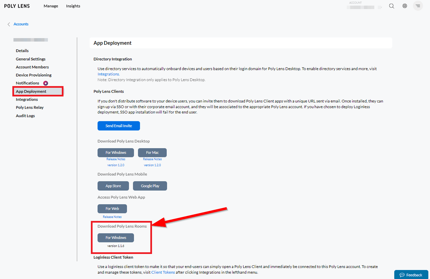 Klicken Sie links in der Navigation auf „App deployment“ und klicken Sie auf „Download Poly Lens Rooms“ um den Client herunterzuladen.
