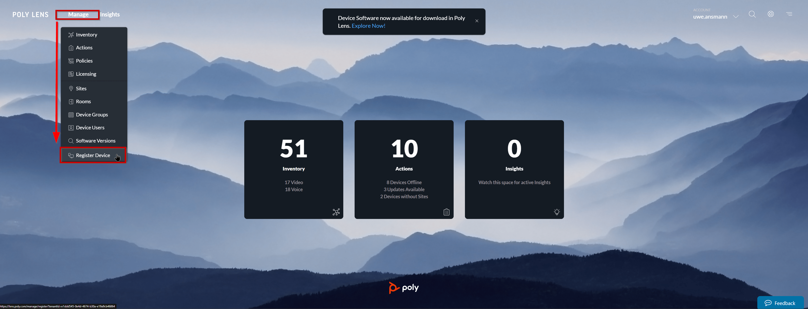 Klicken Sie in der Navigationsleiste im oberen Teil der Webseite auf „Manage“ und anschließend auf „Register Device“ .