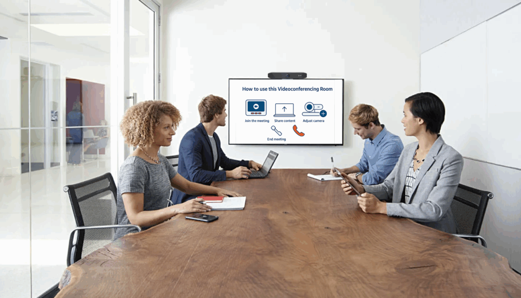 • Innerhalb des Konferenzraums: Poly VC-Systeme mit integriertem Signage im Idle-Modus, ebenfalls gemanaged über Poly Lens.