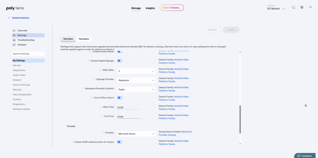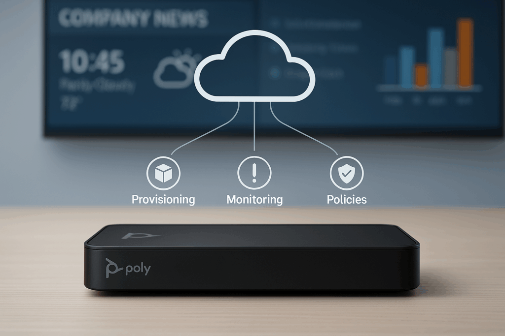 Die Signage-Plattform verwaltet den Content – die G62 spielt ihn ab – und Poly Lens übernimmt das Gerätemanagement.