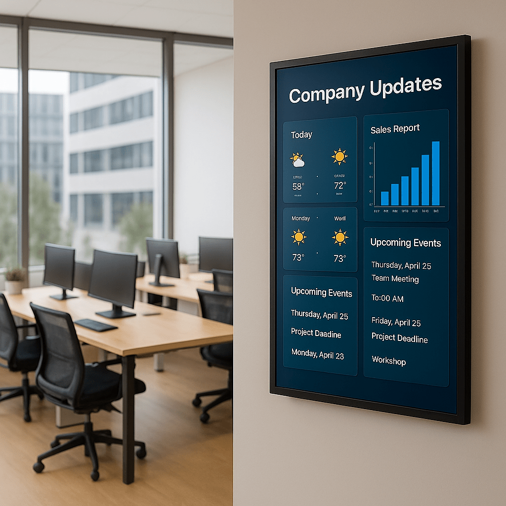 Aktuelle Unternehmensnews, Eventankündigungen, Dashboards oder Besucherbegrüßungen lassen sich in Echtzeit steuern – automatisch, zentral und CI-konform. Und das Beste daran: Inhalte müssen nicht mehr „gesucht“ werden – sie finden den Betrachter von selbst.