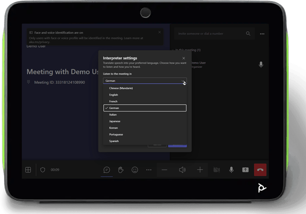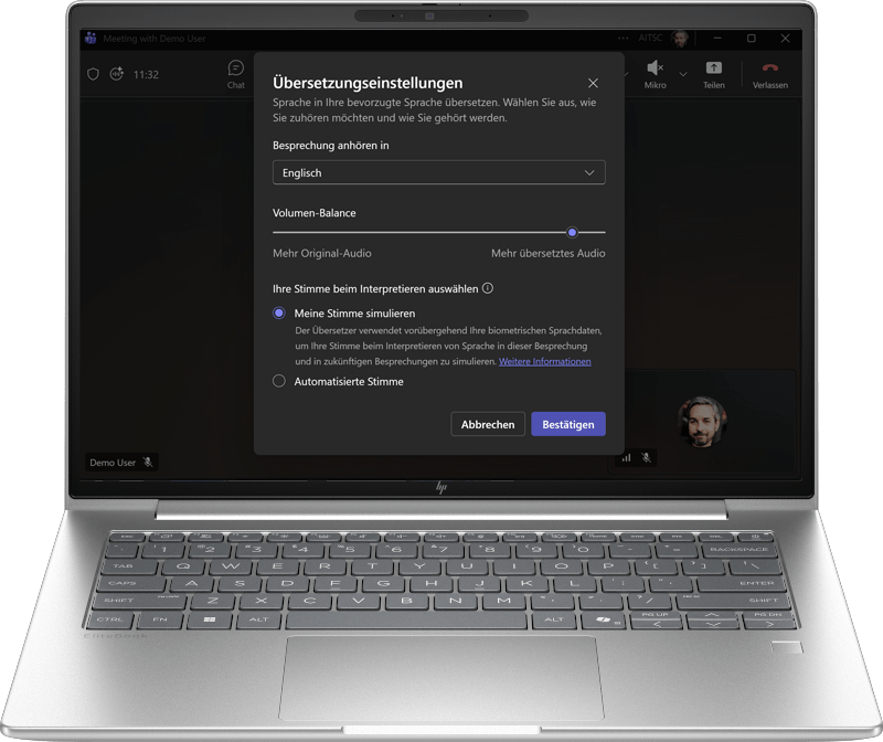Wir sprechen hier nicht nur über Untertitel oder einfache Übersetzungen. Wir sprechen über die Möglichkeit, dass Teilnehmer in ihrer eigenen Sprache sprechen und in Echtzeit in bis zu neun Sprachen verstanden werden – direkt integriert in Microsoft Teams Rooms on Windows, mit einer Teams Rooms Pro Lizenz. Auf Wunsch sogar mit simuliertem persönlichem Stimmprofil.